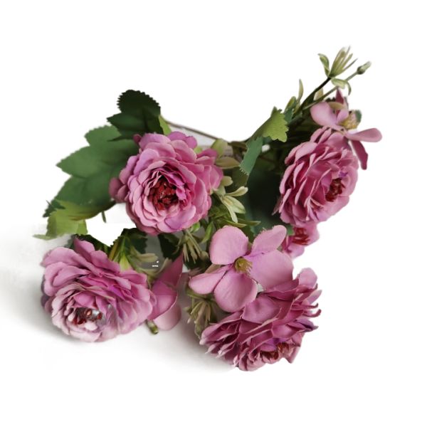 Bodros rózsacsokor – lila. Kiszerelés: 5 szálas, virágfej mérete kb. 5 cm. Csokor hossza kb. 28 cm.