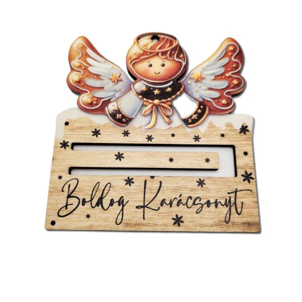 Mézeskalács angyal pénztartó festett fatábla – 10 x 9,2 cm, 1 db. Tökéletes választás ez a pénztartó fatábla, ha az ajándékba adott pénzt különleges módon szeretnéd átadni.
